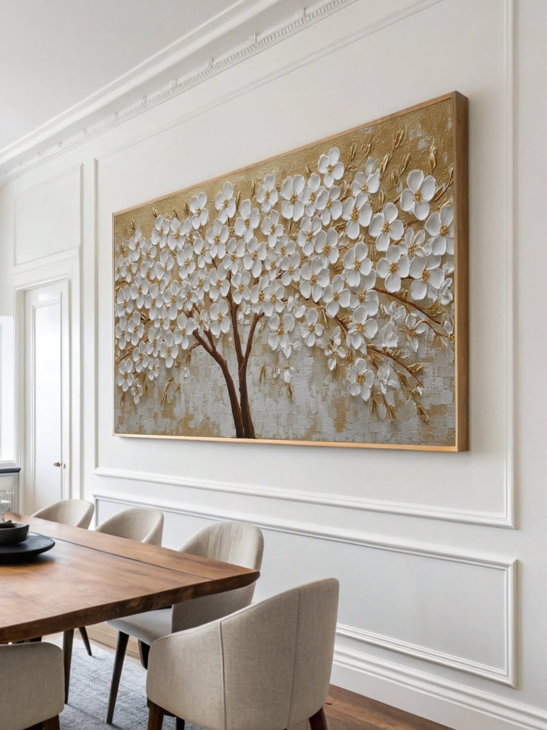 A textura tridimensional de cada flor e folha cria um jogo fascinante de luz e sombra, tornando a peça um ponto focal dinâmico e sofisticado. A paleta de cores, que combina o branco puro com o brilho do ouro e tons neutros de bege e cinza, confere um ar de luxo e leveza. É a escolha ideal para quem busca uma decoração que inspira beleza, renovação e riqueza.