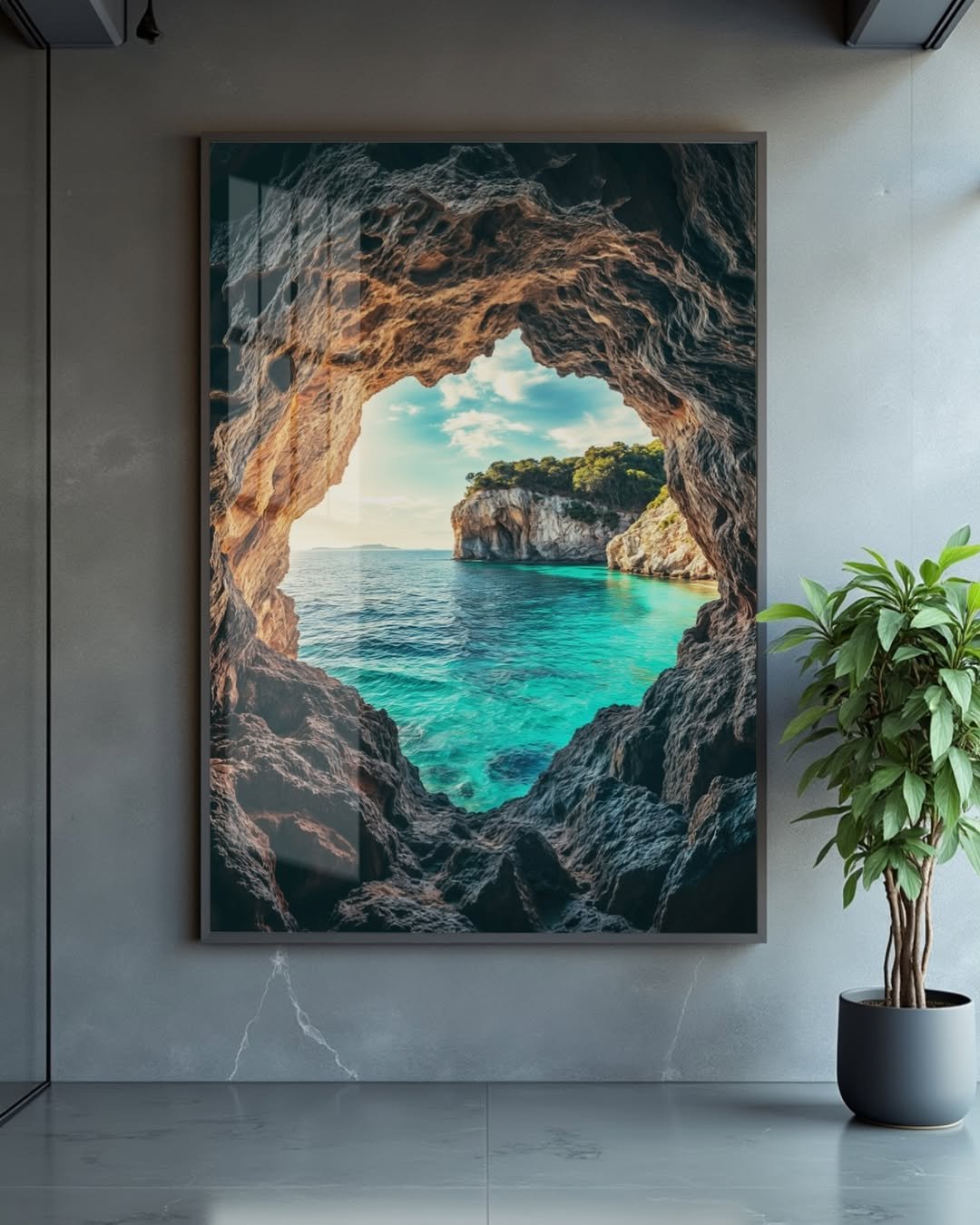 O Quadro Decorativo Vista da Gruta para o Mar é uma verdadeira janela para um paraíso natural. A imagem mostra a beleza do oceano azul visto de dentro de uma gruta, criando a sensação de estar em um refúgio secreto à beira-mar. Com seus tons vibrantes e o contraste entre as rochas e o mar cristalino, transmite frescor, liberdade e inspiração.